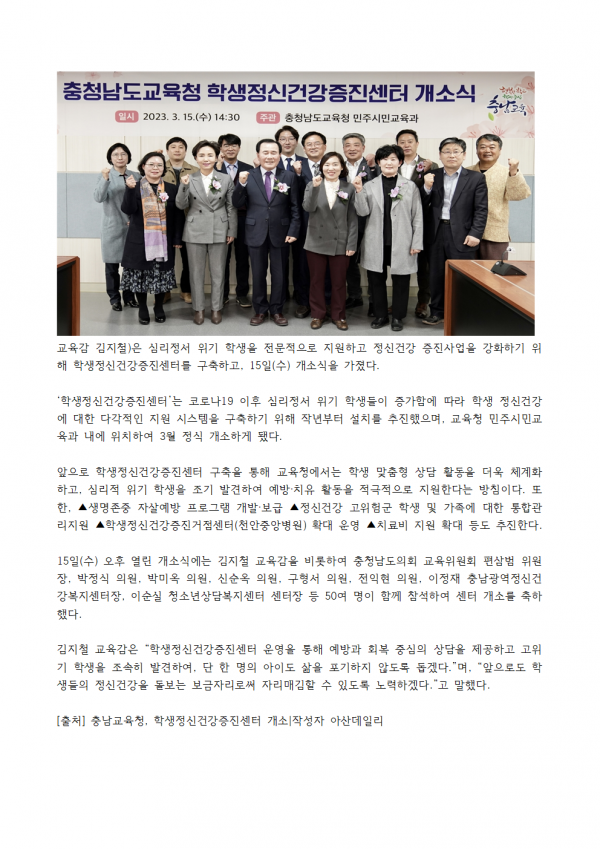 충남교육청 학생정신건강증진센터 개소 위기학생 지원